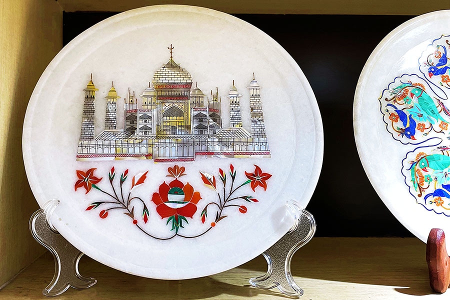 The art of Parchin Kari (marble inlay work) was introduced to India by Persian artisans, who decorated the walls of the Taj Mahal and various other Mughal monuments with this exquisite craft. A marble plate showcasing the intricate art of Parchin Kari, through a depiction of the Taj Mahal. Image: Veidehi Gite