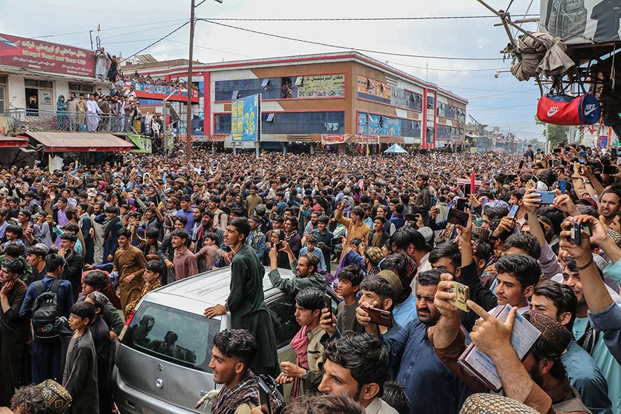 Afghan fans gather to celebrate Afghanistan"s win against Bangladesh during super eight match at the ICC T20 Cricket World Cup 2024, in Khost on June 25, 2024. - Afghanistan advanced to their first-ever T20 World Cup semi-final after completing a dramatic eight-run victory over Bangladesh in a rain-affected clash at the Arnos Vale Stadium in St Vincent on June 25. Image: AFP