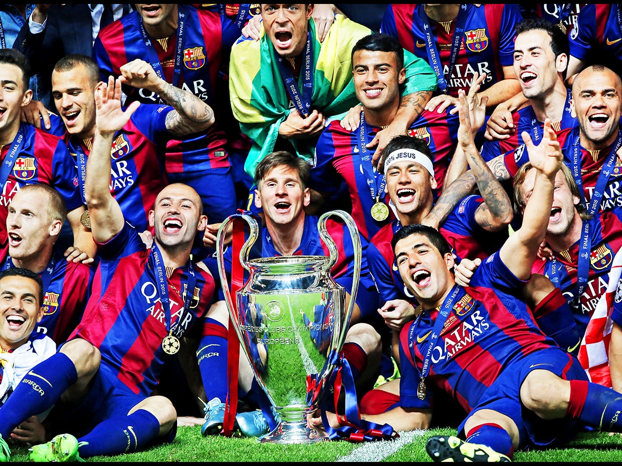 Javier Mascherano, Lionel Messi, Neymar, Luis Suarez, Sergio Busquets, and Daniel Alves of FC Barcelona posing with the Cup after winning the UEFA Champions League final match between Barcelona and Juventus on June 6, 2015, at the Olympic stadium in Berlin, Germany. Image: VI Images via Getty Images
