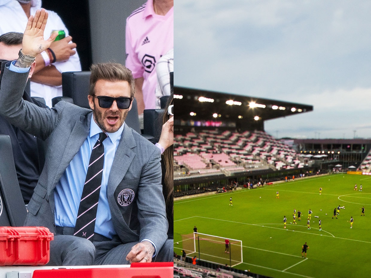 Inter Miami co-owner David Beckham and general view of DRV PNK Stadium, Fort Lauderdale, FL, US. Images: Doug Murray/Icon Sportswire via Getty Images and Nathan Ray Seebeck-USA TODAY SportsImage