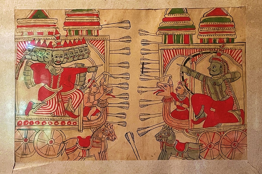 Painting, nearly 400 years old, is one of the oldest depictions of the Thakar Rama-Ravana war from the Ramayana. It is rendered in natural colors—red, green, and blue—the only colors known to the tribal community at the time. The Gangavane family possesses a collection of 1,000 such paintings.