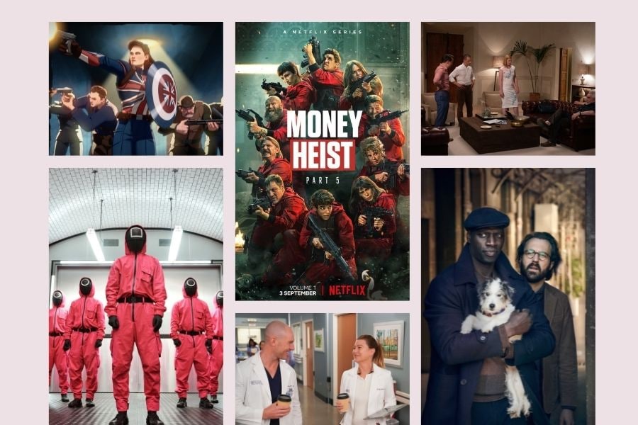Bottom row: Squid Game (Netflix), Grey"s Anatomy (Disney+Hotstar), Lupin (Netflix)