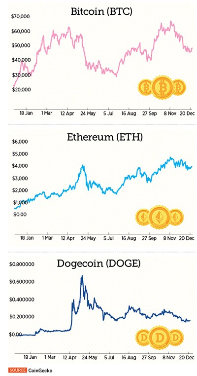 Ethereum started 2021 with a bang, driven by the multiple use cases that it can support, from NFTs to Metaverse. But it is heavily correlated to Bitcoin price trends and corrected from there in the year, only to end 2021 slightly firm at $3,900 levels. Dogecoin really became mainstream in India and elsewhere in 2021 and is expected to continue to gain in popularity. Shiba Inu in 2021 covered much ground and for some experts has started to be considered as a recognised cryptocurrency. 2022 will determine that.