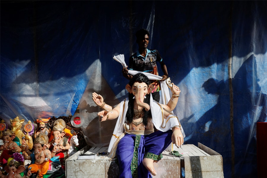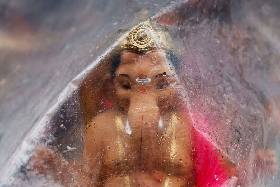 An evocative image of Ganpati shielding from the rainy day at a stall on the eve of the Ganesh Chaturthi festival in Mumbai, India, September 18, 2023.