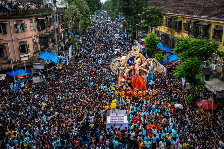 A massive crowd accompanies a gigantic idol of Chintamani Ganesh being carried from its maker’s workshop to a famous pandal in Chinchpokli, Mumbai, ahead of the festival, September 9, 2023.