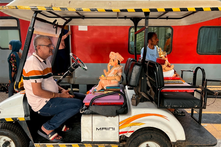 A devotee awaits help to carry a custom-ordered Ganpati into the train compartment at a railway station in Mumbai on September 17, 2023