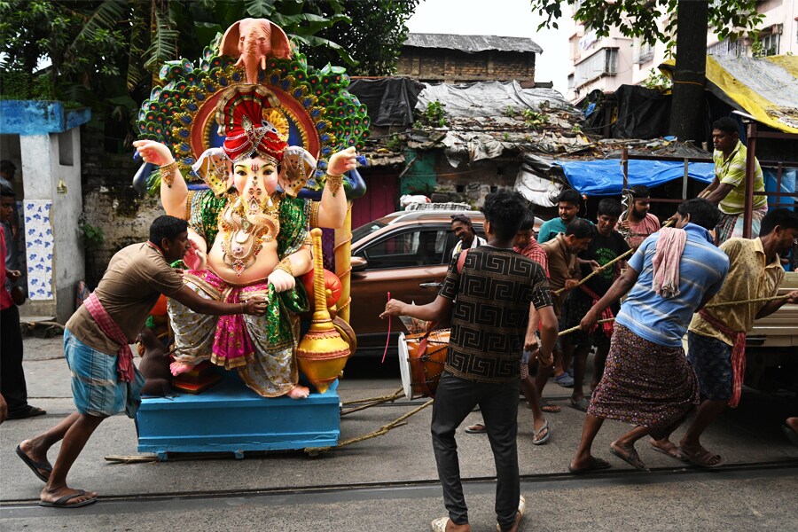 To the accompaniment of drums, workers drag a platform carrying a 12 feet high idol to be transported to a Ganesh Puja pandal in Kumartuli, Kolkata, on September 18, 2023