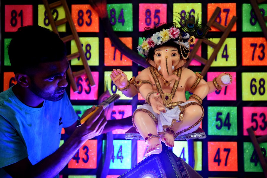 An artist in the village of Pen in Raigad district, Maharashtra - famous for its Ganesha idols - gives finishing touches to one ahead of the Ganesh Chaturthi festival on August 8, 2023.