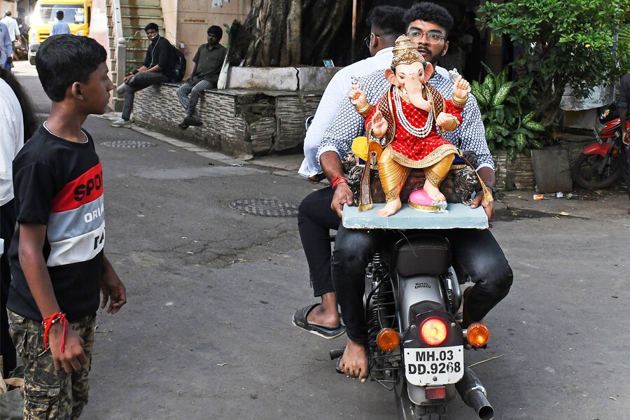 A pillion rider sits in reverse on a motorbike to carry home a Ganpati on the eve of the Ganesh Chaturthi festival celebration in Mumbai on September 18, 2023