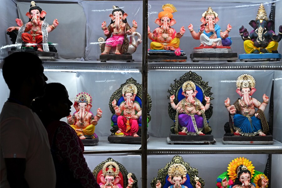 A couple behold many forms and representations of Ganpati on display at a workshop in Mumbai on August 25, 2023, ahead of the festival. These forms and variations have symbolic meanings and stories attached to them.