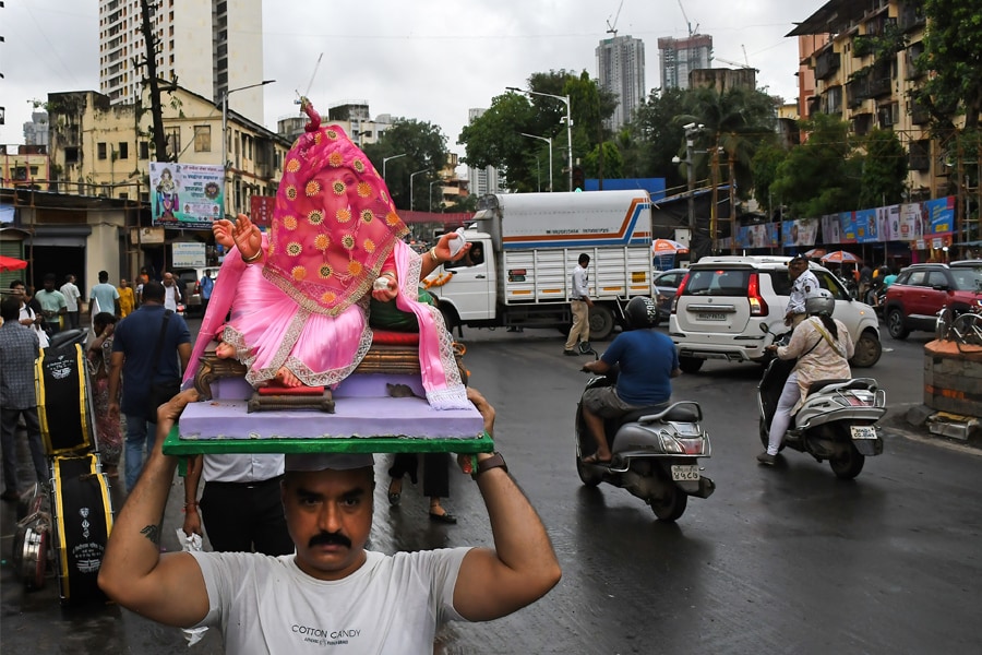 An exquisitely draped Ganpati in pink, veiled to the public, is carried home by a Mumbaikar on his head on the eve of the festival in Mumbai on September 18, 2023
