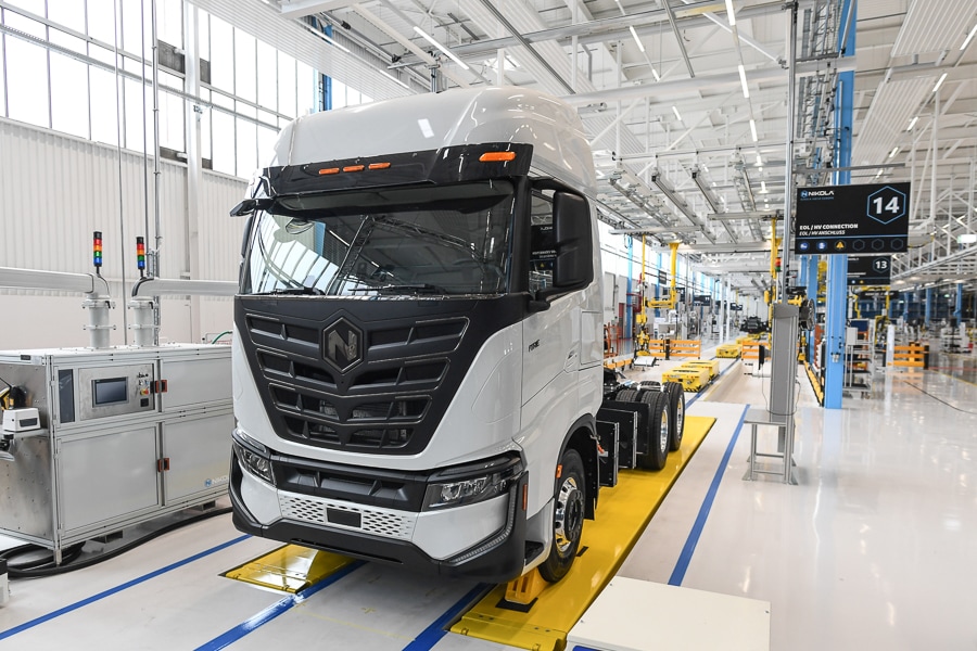 A Nikola Tre battery-electric heavy duty truck at the Nikola Corp.-Iveco SpA joint venture electric truck plant in Ulm, Germany, on Wednesday, Sept. 15, 2021. Nikola Iveco Europe GmbH hosted an event where its partner Iveco—the commercial-vehicle unit of CNH Industrial NV—is preparing to start series production of Nikola Tre heavy-duty trucks by year-end.