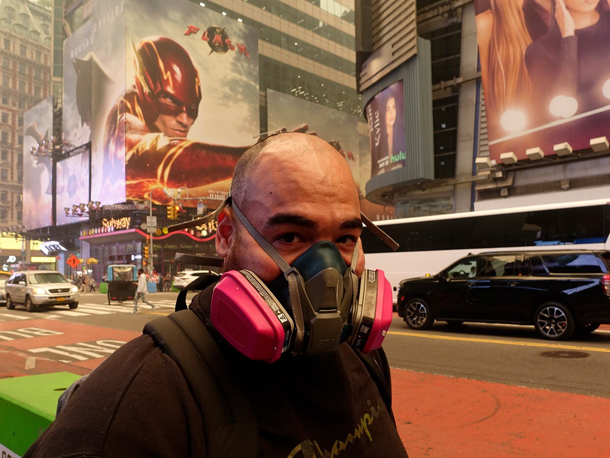 A pedestrian wearing a breathing filter walks in Times Square amid a smoky haze on June 7, 2023, in New York City. A day after the air quality in New York reached historically bad levels, the state was making N95 masks available at state facilities, including New York City. Image: Liao Pan/CNS/VCG via Getty Images