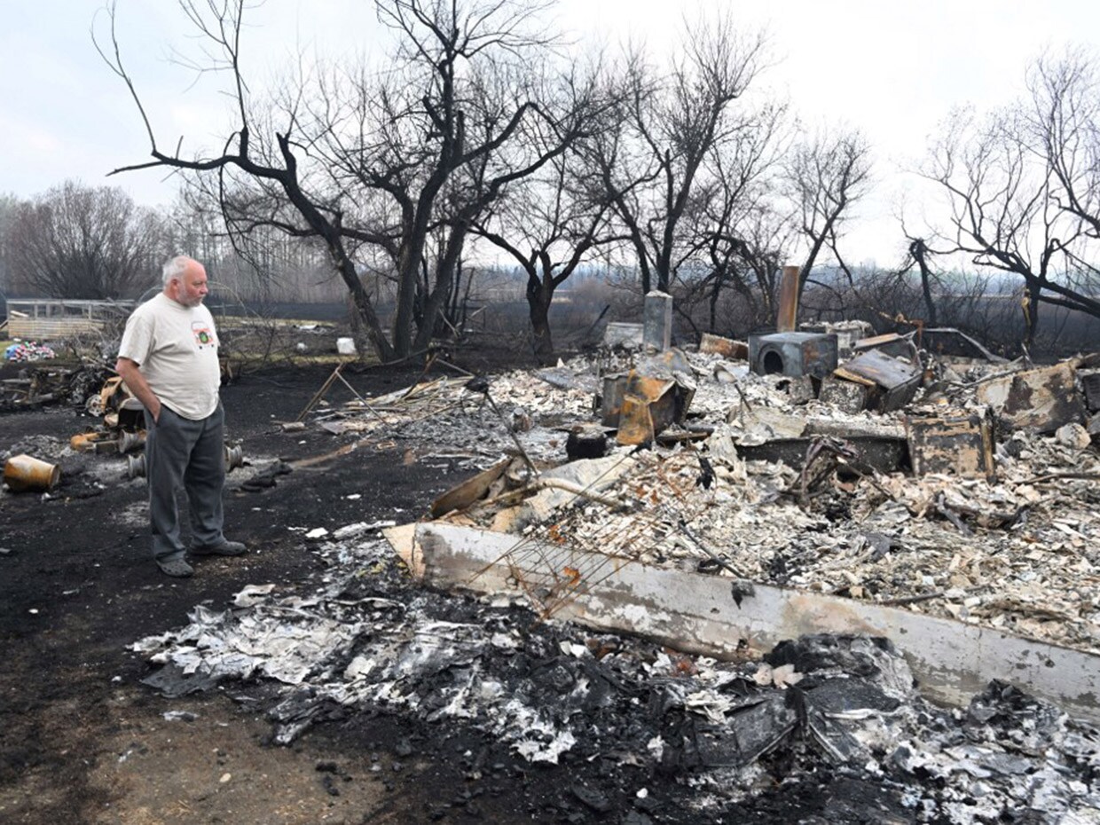 Property owner Adam Norris surveys the damage at his home outside the town of Drayton, Alberta, Canada on May 08 2023. Canada struggled to control the wildfire that has forced thousands to flee, halted oil production and threaten to raze towns, with the western province of Alberta calling for federal help. Image: Walter Tychnowicz / AFP