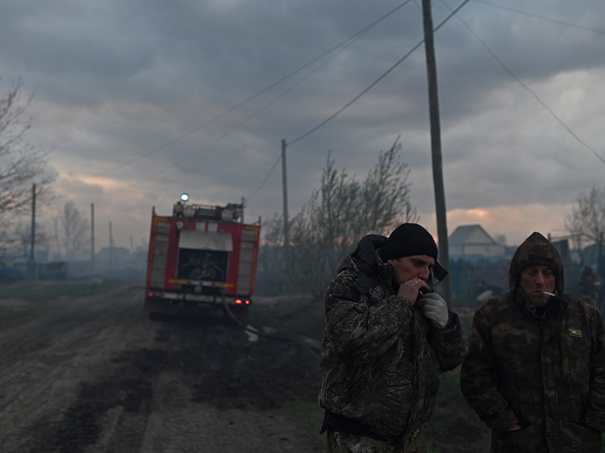 Men smoke next to a fire truck in the town of Nazyvayevsk affected by a fire, as a state of emergency has been declared in the Omsk region, Russia due to wildfires on May 6, 2022. Russia heads the list of countries with an annual average of most forest loss caused by fires at 2.51 million hectares. Image: Alexey Malgavko / Reuters
