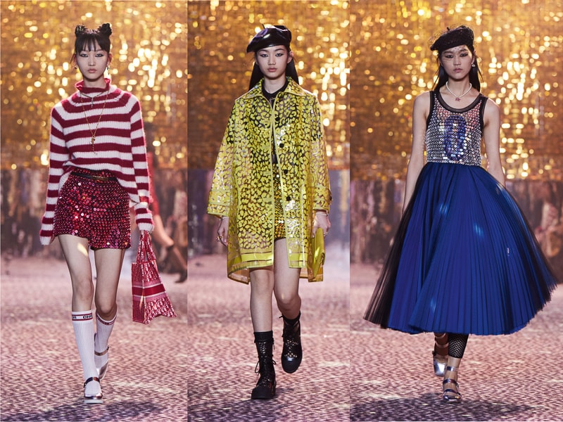 The embroideries on the Bar jacket, the anorak, the blouse, little dresses, and coats are composed of giant sequins, like mirror discs or disco balls.