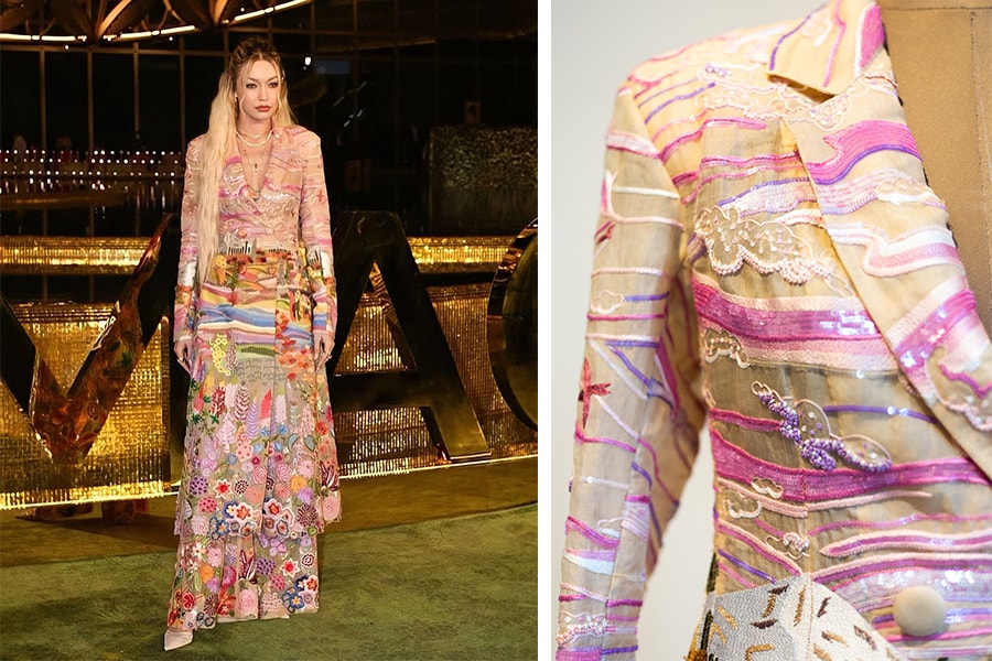 Gigi (Hadid) was very, very clear about what she wanted. She was familiar with the brand so she selected this look. Gigi wanted a sky blue colour with pink embroidery, so we customised it. We made her all new trousers completely going with this. I remember when she walked in, she was like ‘Oh my god, this is beyond couture. This is something that is so fabulous and yet so lightweight, easy to wear’. She said she could wear it with a T-shirt and denim. She was giving so many options. I kind of liked it and her approach.