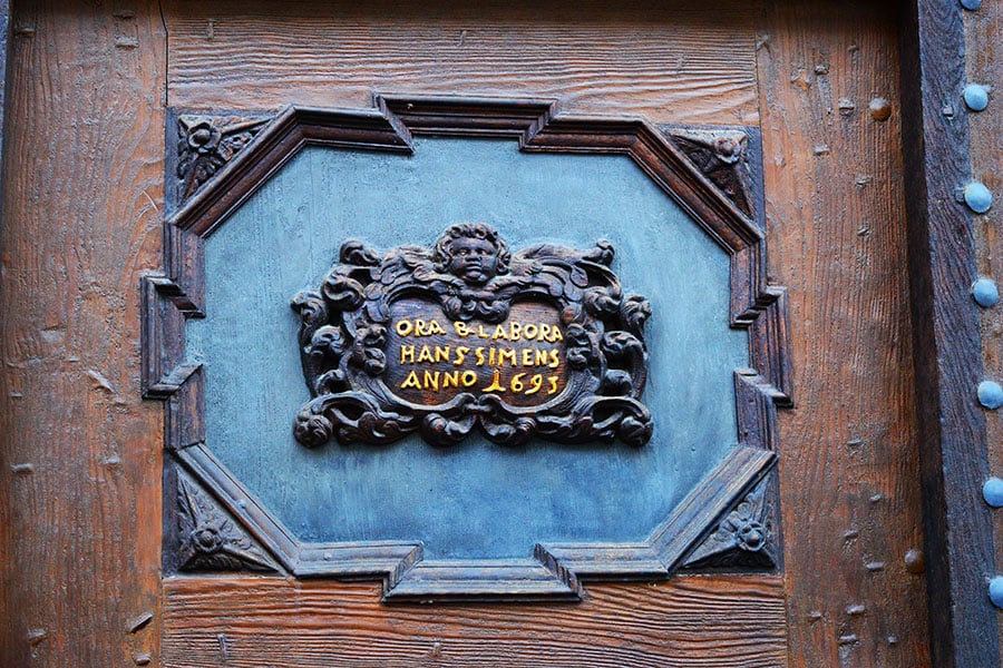 A plaque on the Siemens House door. Once a year, the entire Siemens family meets in this house and has the traditional pea soup to honour their ancestry and the family’s age-old customs.