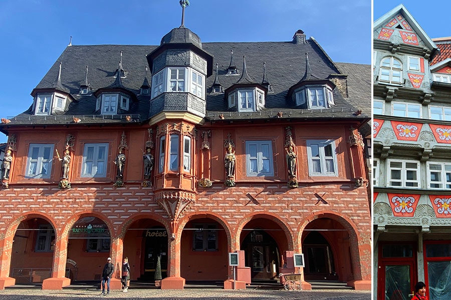 Kaiserworth’ Hotel built by the cloth merchants in 1494 and now a hotel and a popular picture spot in Goslar"s Market Square. (Right) A detail of a half-timbered building in Quedlinburg.