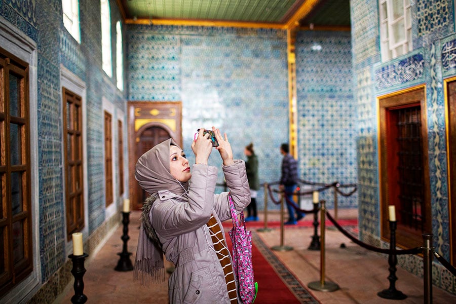 A woman takes pictures in Hà¼nkar Kasri in Istanbul in November 2019. All the walls at Hà¼nkar Kasri are covered in rare and exquisite Iznik tiles from the 17th century, some specially created for this building. Image: Danielle Villasana/The New York Times