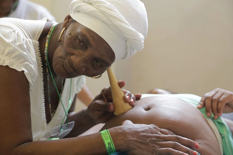 An Afro-Colombian midwife provides attention to a pregnant woman by listening to her womb with traditional techniques in Colombia. Companions and supporters of pregnant women and their families before, during and after birth, midwives make home visits, provide guidance and care, and facilitate birth preparation and capacity-building classes. Traditional midwifery knowledge is accumulated through direct experience, observation and interaction with the human body.They protect fundamental human rights by transmitting their knowledge to mothers and families. It varies according to the social, cultural and natural contexts of different communities and countries and sometimes includes knowledge of traditional medicine, medicinal plants and herbs. The related skills and expertise have been safeguarded, developed and passed on by practising communities for generations, especially within networks of women.