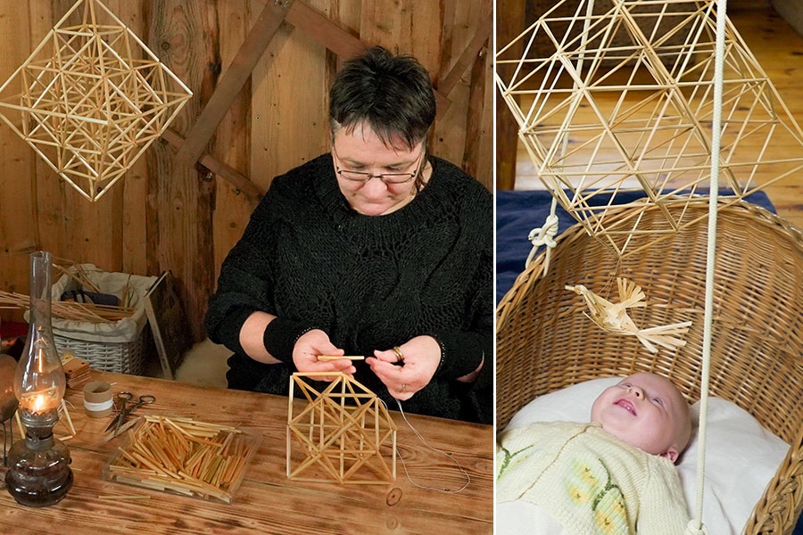 Sodai crafter Loreta LichtaroviÄienÄ— demonstrates the making of Sodai at her workshop in Vilnius District. Sodai straw gardens are hanging ornaments made from the stalks of grains. This practice involves the cultivation of grain (typically rye), treating straw, and creating geometric structures of varying sizes. The structures are then decorated with details symbolising fertility and prosperity. Sodai gardens are believed to reflect the pattern of the universe and are associated with well-being and spirituality. They are hung over the cradles of babies, weddings, family tables, Easter and Christmas to wish happiness to newborns, fertility to newlyweds or harmony to the family. Although most practitioners are women, workshops are open to people of all ages and genders. They provide a sense of shared cultural heritage and continuity to the practising communities while strengthening communal partnerships, intergenerational bonds and cultural diversity.