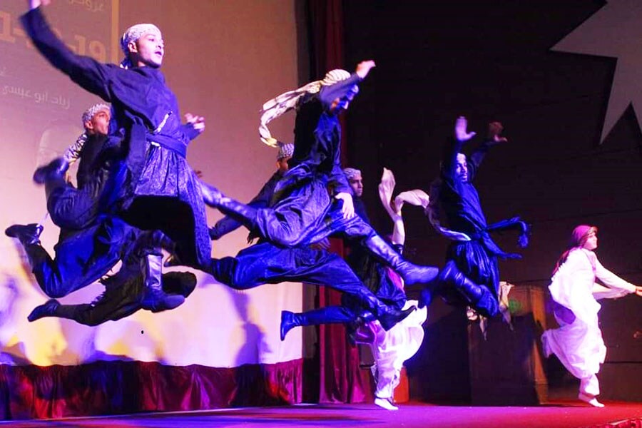 Dabkeh dance performance in Lebanon by the Keffiyeh Ensemble in Palestine. Dabkeh is a popular group dance in Palestine accompanied by traditional wind instruments and popular singing. A social activity, it is performed in several regions during festivals, celebrations and events such as weddings and graduations. Dabkeh is performed by eleven dancers, regardless of gender. The movements involve jumping and hitting the ground with their feet. Dabkeh and the accompanying arts and crafts are transmitted informally through one-on-one learning and training. Dabkeh is a means of expressing cultural identity, celebrating family occasions and increasing social ties.