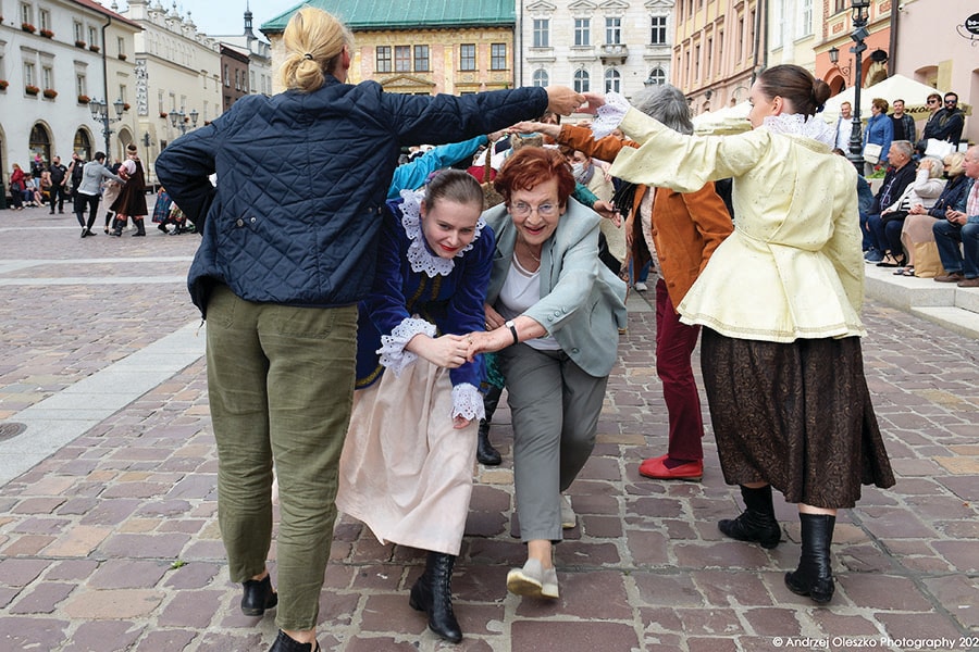 The polonaise is a joyful Polish group dance, which a few can enact to even several hundreds of pairs marching in procession, following a trajectory proposed by the first pair. During the dance, the pairs perform various figures, such as raising joined hands to create bridges under which other participants can pass. The practice is typically transmitted within families, educational institutions, dance groups, and local communities. A form of joint celebration, the polonaise commemorates important moments in family and community life and symbolises cooperation, reconciliation and equality. Because people of all ages and backgrounds often dance it, it also promotes unity, solidarity and dialogue.
