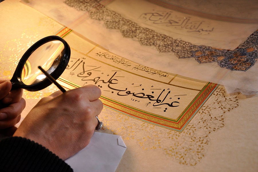 Tezhip ( Illumination) is a centuries-old decorative art practised on the pages of manuscripts, calligraphic texts and miniatures. The main component is a gold leaf or gold paint, which entails specific knowledge and techniques. The colours, patterns, and motifs used have symbolic meanings, and it is common to embellish religious texts, literary and historical manuscripts, marriage deeds and even commercial treaties with illuminations. Today, traditional and contemporary interpretations of the element can be seen in manuscripts, miniatures, calligraphy, and stand-alone pieces of art.
