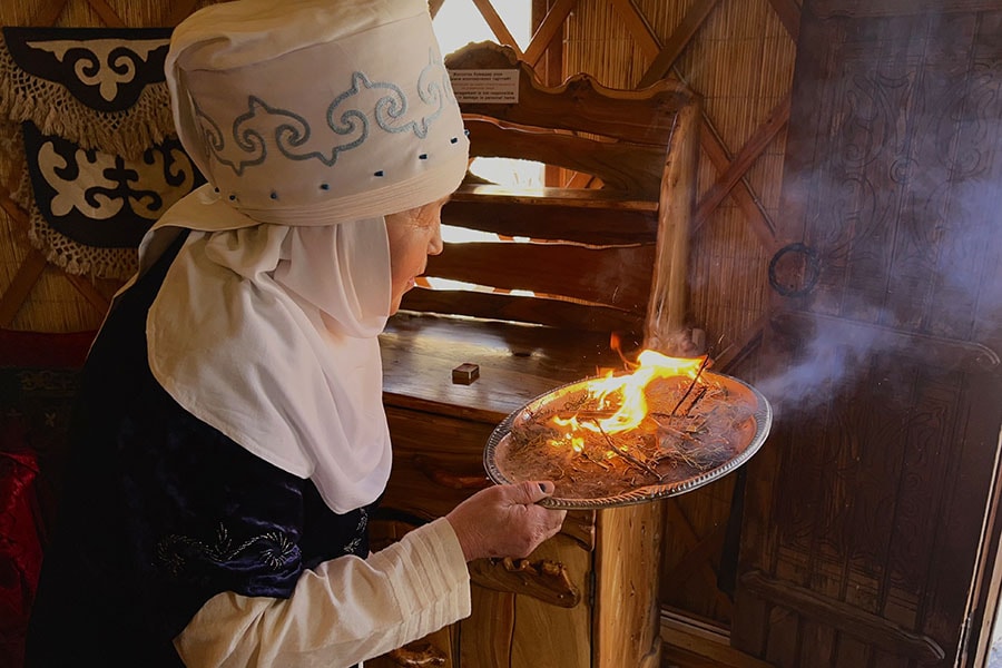 The ritual of elechek wrapping starts with burning the juniper to purify the physical and spiritual space. Elechek is a traditional female headwear consisting of a hair cap and a very long piece of white fabric wrapped around the head like a turban and adorned with embroidery, ribbons and jewellery. The practice is an integral part of the traditional marriage ceremony in Kyrgyzstan. A rite of passage, the ritual of wrapping the bride"s first elechek takes place at her family"s house before she leaves with the groom. A married woman may wear the elechek on significant occasions, changing its styles accordingly. The knowledge and skills are usually transmitted informally during wrapping ceremonies, from mothers to daughters and from female elders to younger women, strengthening intergenerational ties and promoting solidarity and empowerment.
