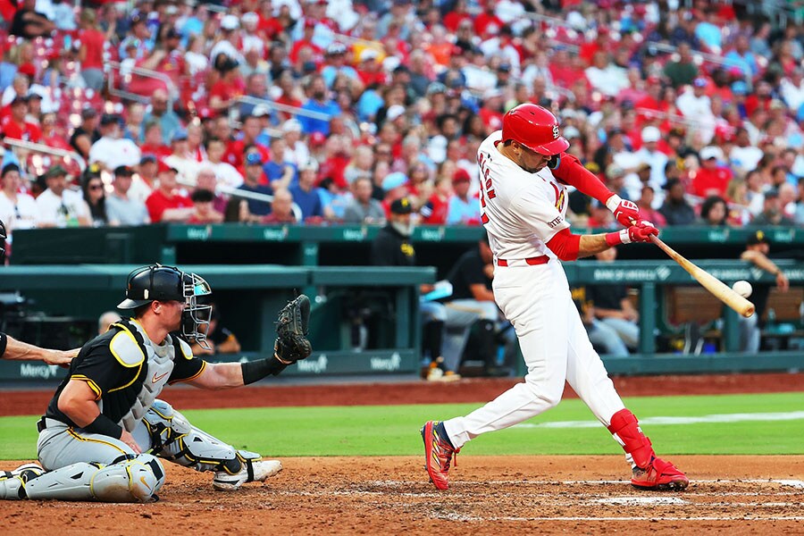Dylan Carlson of the St. Louis Cardinals drives in a run against the Pittsburgh Pirates on June 12, 2024, in St Louis, Missouri.