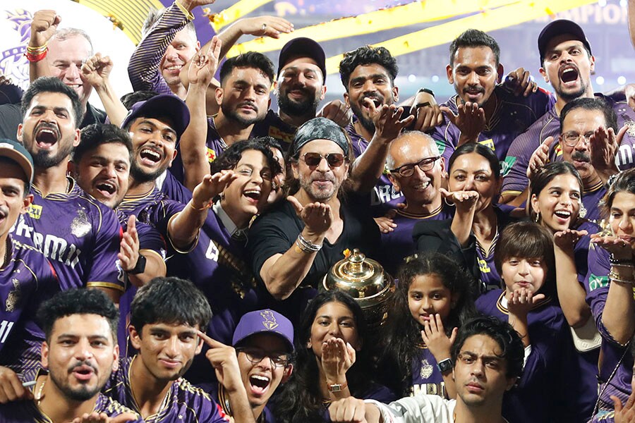 Kolkata Knight Riders" team and co-owner Bollywood actor Shah Rukh Khan pose with the Indian Premier League winning trophy on May 26, 2024, in Chennai, India.