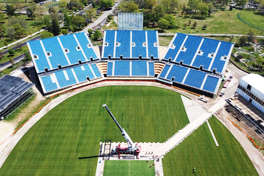 The pitch being laid at the Nassau County International Cricket Stadium under construction in Eisenhower Park in East Meadow, New York, ahead of the ICC Men"s T20 World Cup 2024.