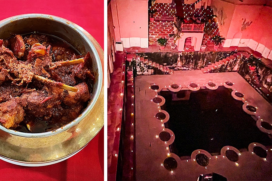 The Junglee Maas, a traditional hunting delicacy the Bawri is decorated with hundreds of diyas at nightCredit Veidehi Gite