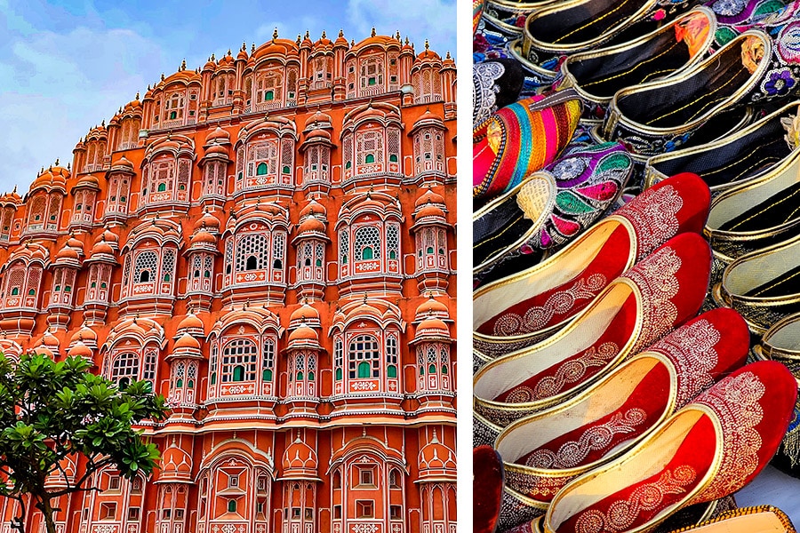 Hawa Mahal, Jaipur"s crown jewel handcrafted jhootis at a craft market in the city as Image: Shutterstock Veidehi Gite (right image)