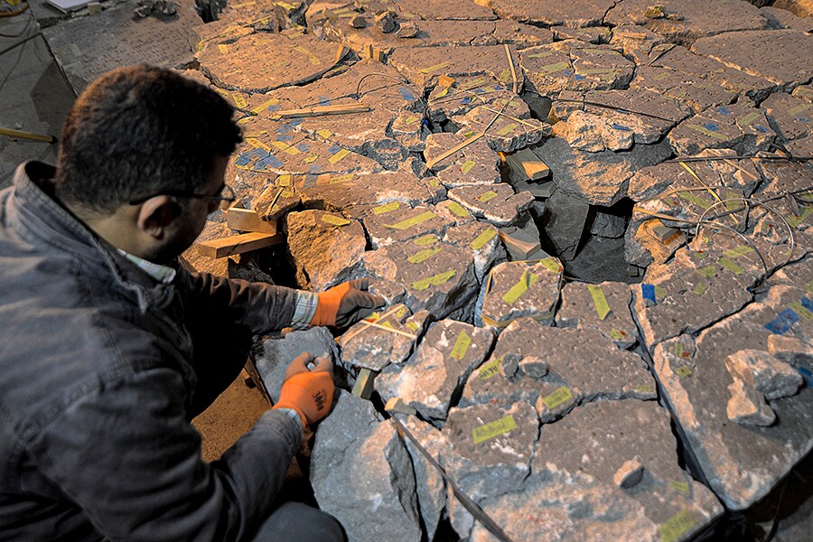 The smallest of these fragments— no bigger than a fist—are lined up on a table, and experts are hard at work sorting through them.