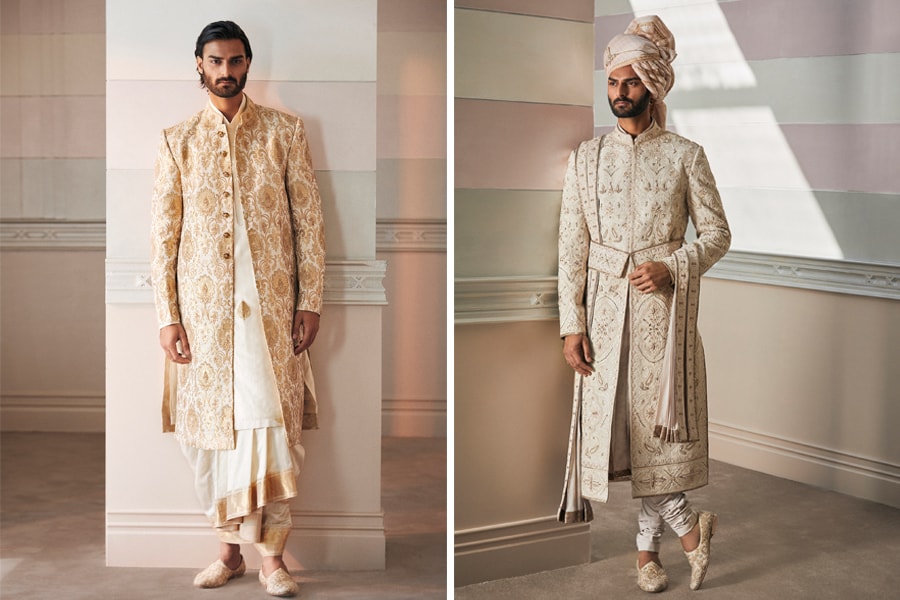 Tarun Tahiliani launched his S/S 2021 collection – Timelessness – on Instagram via a virtual fashion show in early March. Supporting local craftsmen and artisans, the collection introduces sherwanis with lightweight free-flowing stoles for ideal summer weddings[br]