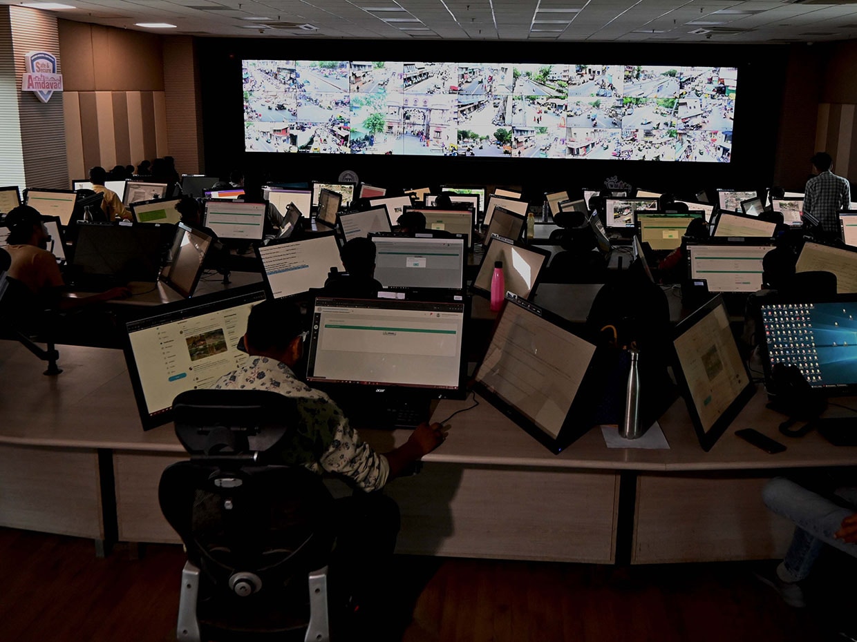 People monitor the CCTV camera of Ahmedabad municipal corporation (AMC) for any damage due to the expected landfall of Cyclone Biparjoy at Gunau village of Kutch District, India, on June 14, 2023.