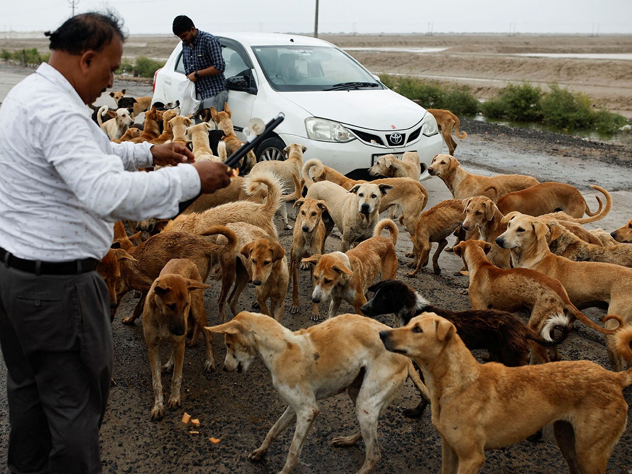 People feed dogs that had been left behind when everyone was evacuated from Jakhau port before the arrival of cyclone Biparjoy in the western state of Gujarat, India, June 14, 2023.