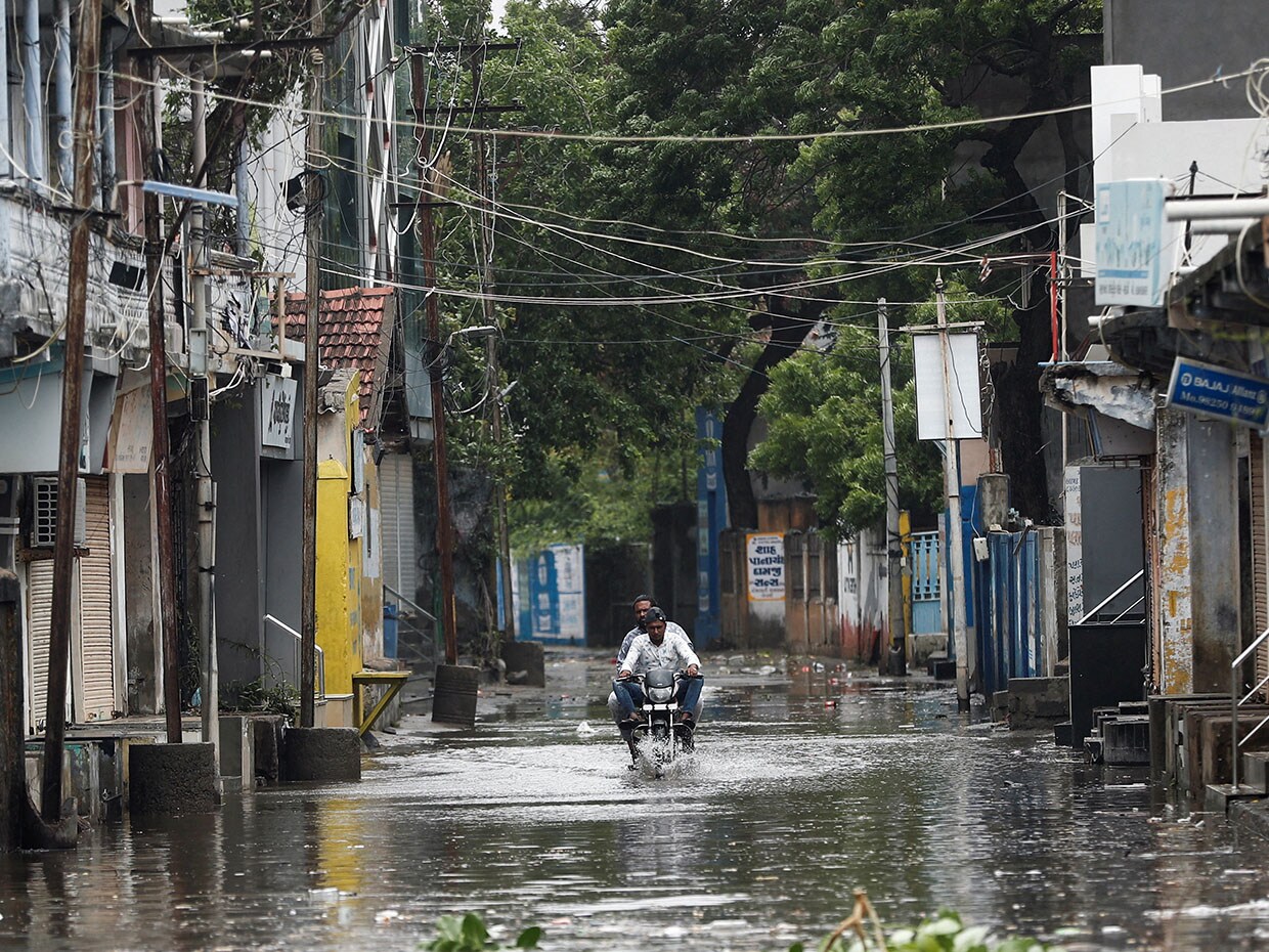 A man rides a motorcycle through a waterlogged street in Mandvi before the arrival of cyclone Biparjoy in the western state of Gujarat, India, June 15, 2023.