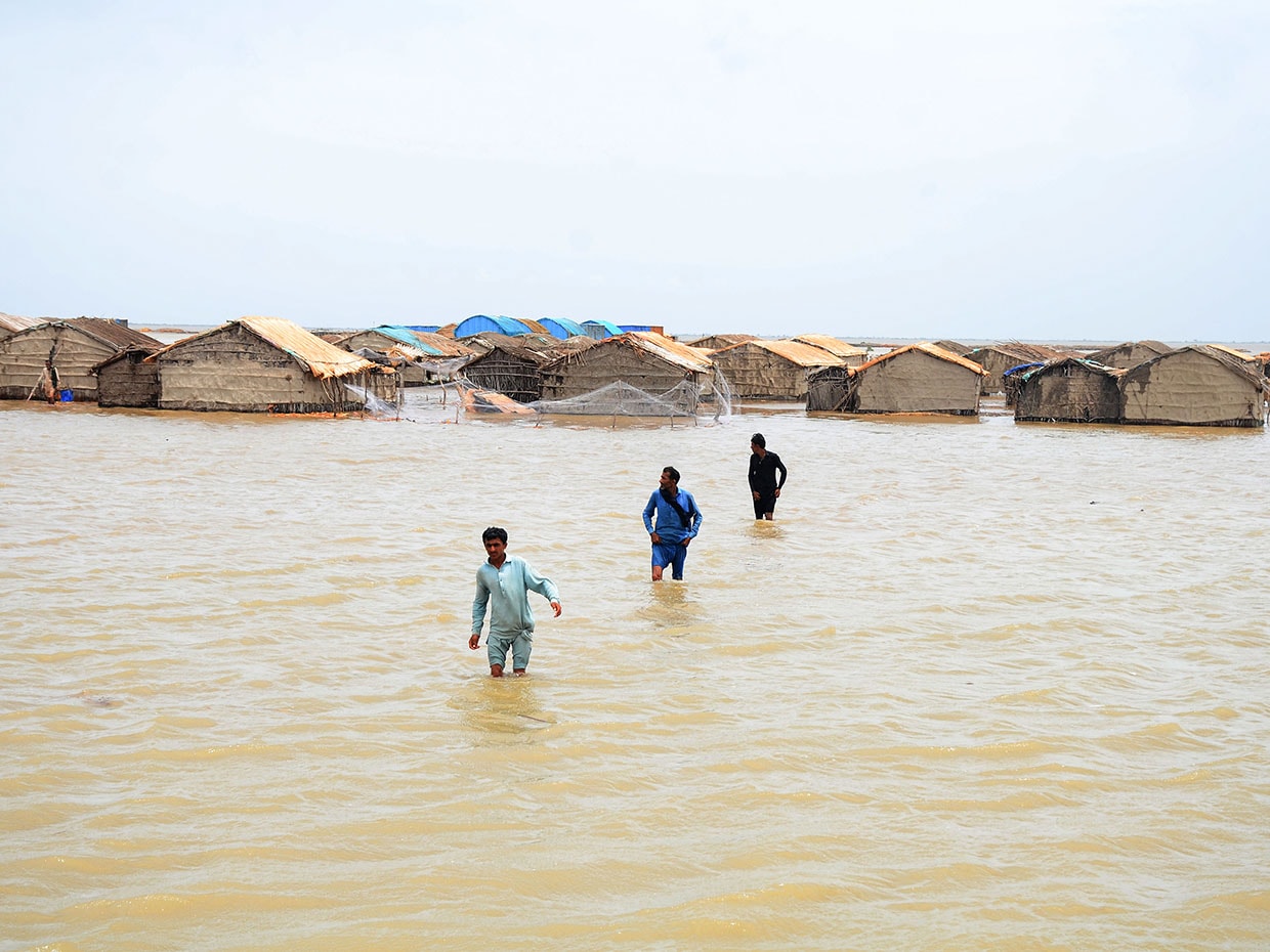 Cyclone-affected people wade through water as cyclone Biparjoy rises sea level in a coastal area in Sujawal of Pakistan"s Sindh province on June 15, 2023. Howling gales and crashing waves pounded the coastline of India and Pakistan on June 15, in the hours counting down to the landfall of a powerful cyclone that has prompted mass evacuations.