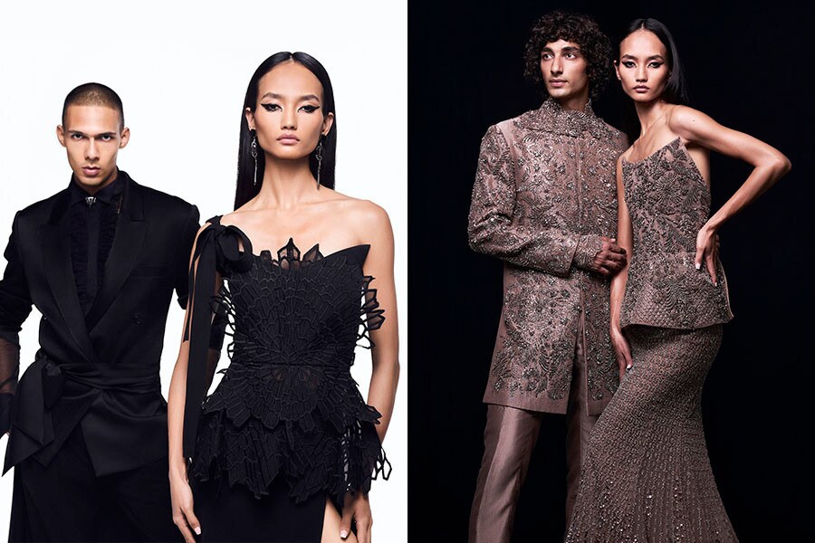 Q. What was the inspiration for the otherworldly vision of Nocturnum? Can you share your creative process with this particular collection? Nocturnum is inspired by our fascination with the night sky and the beautiful transformation of meteors and stars. We envisioned these celestial bodies evolving into organic forms before they reach Earth, merging the rigid geometry of meteors with the fluidity of nature. Our creative process involved hand-drawing patterns that captured this dual nature, using rich velvets and shimmering silks to evoke the night sky and starlight. It was a challenge to balance structure and softness, but once we achieved that harmony, the collection came to life. Q. How did your choice of colour palette, which is a departure from your signature palette and fabrics, contribute to the narrative of Nocturnum? We aimed to reflect the theme of light within darkness for Nocturnum with our colour palette. We introduced rich golds, especially mocha gold, which is a departure from our usual tones. These shades represent the warmth and glow of starlight against the night sky, adding depth and luxury to the collection. In terms of fabrics, we chose rich velvets to symbolize the mysterious darkness of the night, while silk satins and tulles brought in the fluidity and shimmer of starlight. The combination of colours and fabrics helped us capture the celestial and transformative essence of Nocturnum, balancing structure with fluidity.