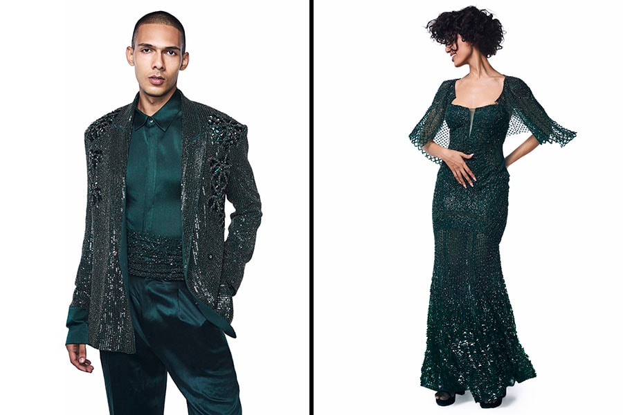 Q. How did the use of geometric patterns of meteors influence designs in this collection? The geometric patterns of meteors had a major effect on the designs of Nocturnum. The dynamic shapes and crisp lines of meteors, which stand for energy and motion, inspired us. We employed detailed embroidery that mimicked the pathways of meteors, layered textures, and geometric cuts to bring this concept into the designs. This gave us the opportunity to capture the spirit of these heavenly bodies, combining movement and detail to produce compositions that are at once grounded and otherworldly. Q. What were some of the challenges when attempting to capture the essence of this collection? Did you use innovative methods to bring it to life? Creating the Nocturnum collection for men and women was all about striking a balance between structure and fluidity while remaining devoted to the celestial motif. We updated traditional formal attire for the men"s items by adding long tails and pointed cut-outs that mimic the exact, angular outlines of meteors. We concentrated on combining delicate aspects with structure in the women"s designs, such as the asymmetrical dresses that reflect the stars" slick flow across the sky.