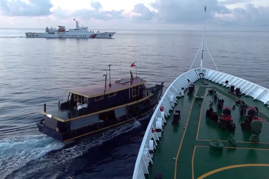 A China Coast Guard vessel (right) blocks and collides with a Philippine supply boat in the disputed waters of the South China Sea in this screen grab obtained from a handout video released on October 22, 2023. The Philippine boat was on its re-supply runs to an outpost on Second Thomas Shoal in the Spratly Islands, a hotly contested region where Beijing deploys ships to assert its claims over almost the entire sea.