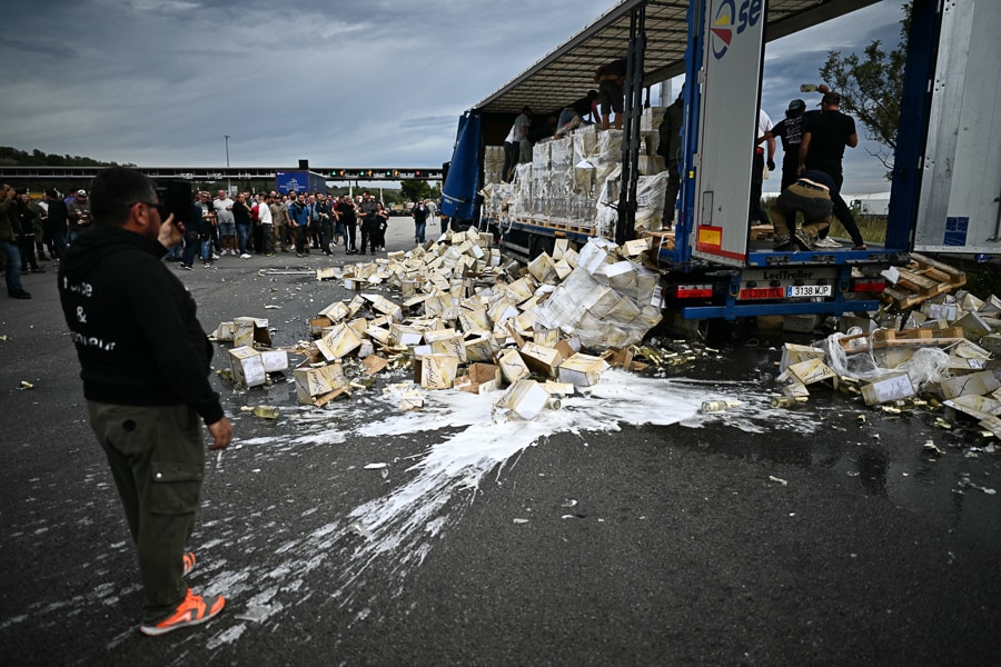 Winegrowers destroy bottles of wine from a truck during a roadblock demonstration to protest against imports of Spanish wine on the motorway close to the Spanish border, Le Boulou, France, on October 19, 2023. Winegrowers in southern France have called for demonstrations to demand economic support for the regional wine industry, which has endured a trying vintage amid difficult climatic conditions.