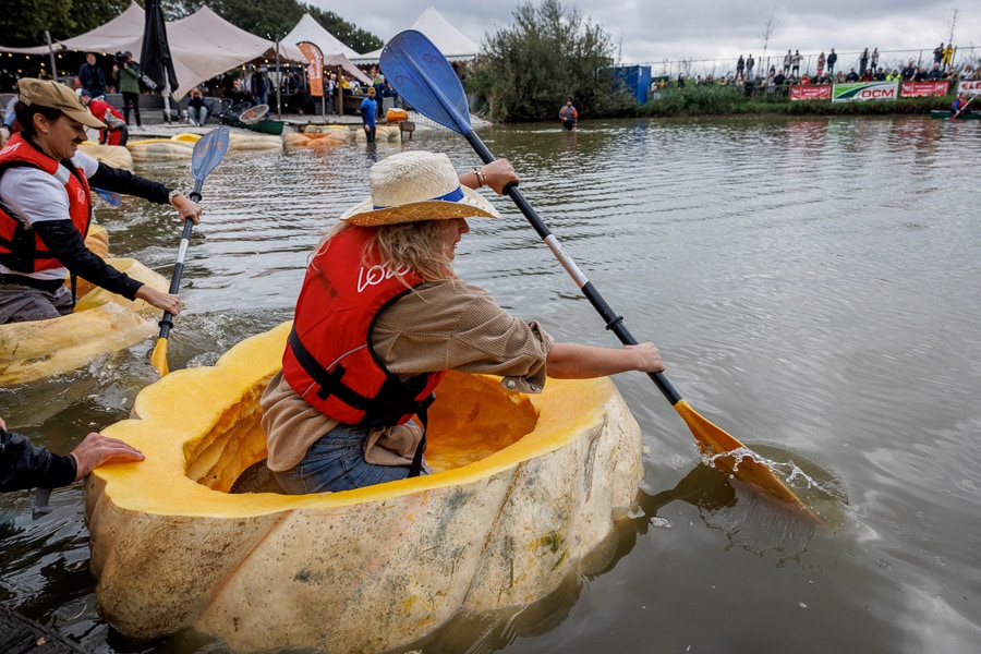 Participants paddle in hollowed-out giant pumpkins during the Pumpkin Regatta in Kasterlee, Belgium, on October 22, 2023. "Every year, we begin with little pumpkins, and each year, we harvest the seeds from the larger pumpkins and combine them to create ever-larger pumpkins." Gert Peeters, the organiser and pumpkin patch owner, was quoted as saying.
