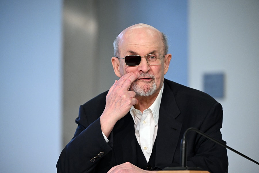 British-US author Salman Rushdie gestures as he addresses a press conference at The Frankfurt Book Fair in Frankfurt am Main, Germany, on October 20, 2023. It marked a rare public appearance for Rushdie, who survived a knife attack, losing his eye, while on stage in New York State in August 2022. Rushdie said that if authors are only allowed to write characters that mirror themselves and their own experiences, "the art of the novel ceases to exist".