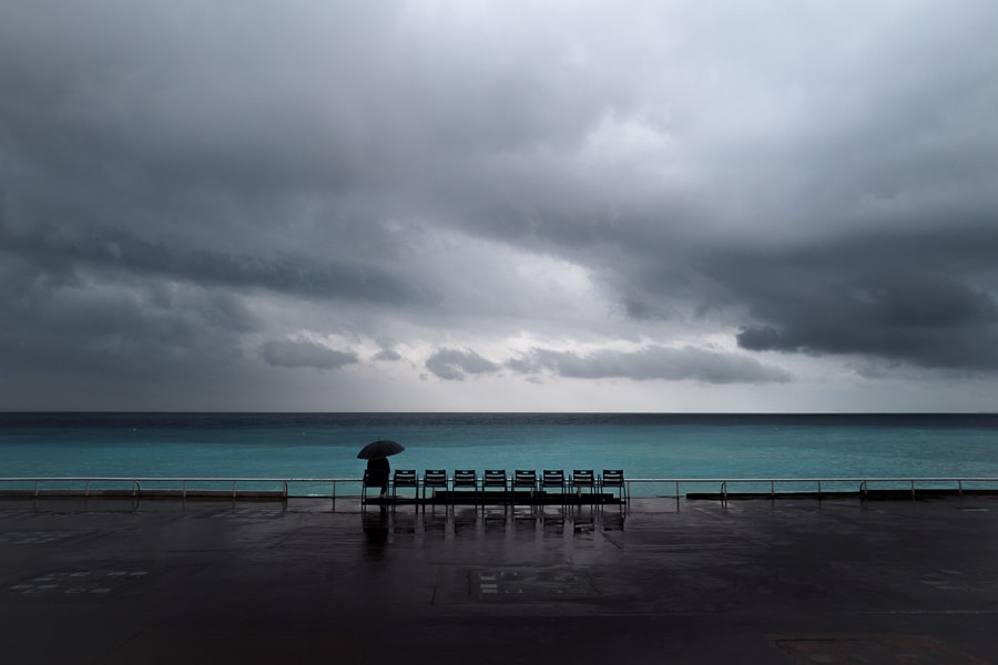 A man looks out into the Mediterranean Sea on the "Promenade des Anglais" in the French Riviera city of Nice on October 19, 2023. The tourism brochures declare that suncream, sunglasses, and hats are an absolute must, even in the early spring and late autumn.
