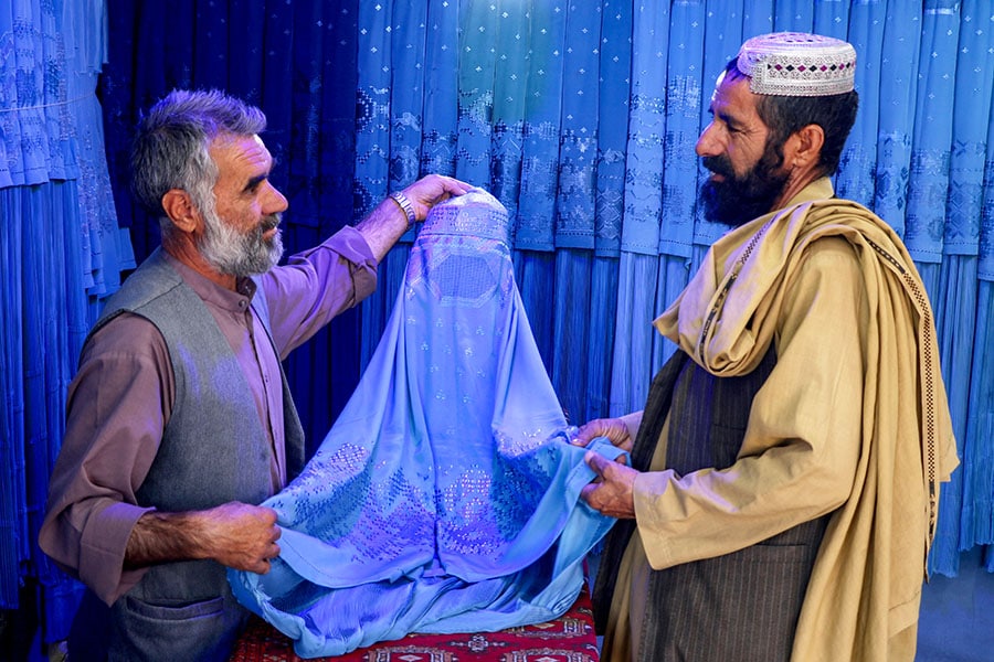 An Afghan tailor shows a burqa to a customer at his shop in Herat, Afghanistan, on October 1, 2023. Reinforcing Afghanistan"s patriarchal system, where men decide for and on behalf of women, the Taliban rolled back Afghan women"s rights by decreeing that women must be fully covered from head to toe—including their faces—to appear in public.