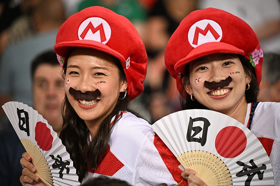 Japan supporters dressed as the Nintendo character Mario pose for a photograph in the stands ahead of the France 2023 Rugby World Cup Pool D match between Japan and Samoa at the Stadium de Toulouse in Toulouse, France on September 28, 2023. Japan"s dedicated female rugby fans form groups and pool to travel to other nations, likening the experience of watching a rugby match to "getting an encouraging pep talk".